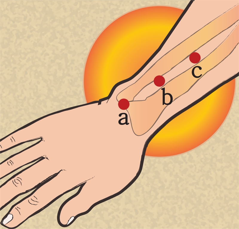 요추 주변의 근육이 긴장하면 통증이 온다는 것은 바꾸어 말하면 요통이 없으려면 허리 근육의 긴장이 없어야 한다고 말할 수 있습니다. 혼자서 요통을 해결하는 간단한 방법을 소개합니다. 요추 근육의 긴장을 풀어주어서 통증을 사라지게 하는 방법입니다. 좌측 요통이라 가정하고 설명드리겠습니다. 우측 손등이 보이게 몸 앞 가운데에 둡니다. 손목의 가운데를 만져보면 노뼈와 자뼈가 만나는 점(a)가 있습니다. 손목에 시계를 찼다고 가정했을 때 시계몸통이 위치하는 손목의 가운데 점입니다. 점(a)와 점(a)의 1cm위의 점(b) 그리고 2cm위의 점(c)을 왼쪽 엄지손가락으로 누르고 노뼈를 따라 밀어올리듯 눌러주세요. 요통의 위치에 따라 치료점이 다를 수 있습니다. 하지만 걱정하지 마세요. 점 (a), (b), (c)중 가장 아픈 곳이 치료점이 됩니다. 만약 다 아프면 다 누르시면 됩니다.(그림 참조)