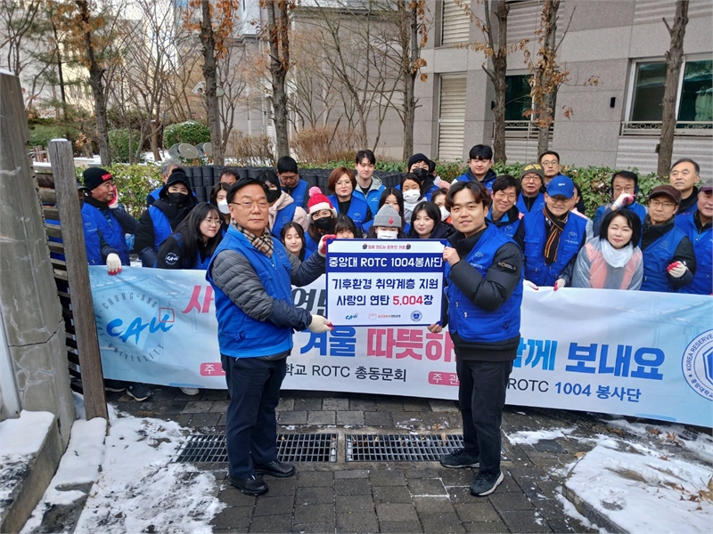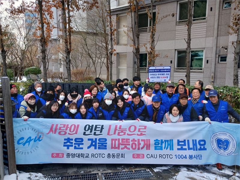 중앙대학교ROTC 1004 봉사단(단장 오병하,26기)이 지난 12월 6일 서울 동작구 정금마을에서 ‘함께 따뜻한 겨울나기’ 연탄 나눔 봉사활동을 진행했다. 이번 봉사에는 중앙대 ROTC 동문과 총학생회, 현대병원 재난의료봉사단, 동작구 자원봉사센터 등 총 44명이 참여했으며, 취약계층 8가구에 연탄 2,000장(가구당 250장)을 배달했다.