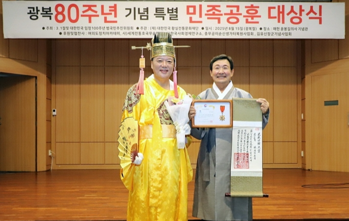 제80주년 광복절을 맞아 8월 15일 오후 3시 매헌윤봉길기념관 대강당에서 열린 민족공훈특별대상 시상식에서 김용겸(9기,경희대) 동문이 문화·예술 부문 유공자로 선정돼 수상했다. 이번 행사는 3·1절 및 대한민국임정100주년기념 범국민추진위원회(총재 김광을, 이하 범추위)가 주관해 열렸으며, 대한민국 해방 80주년을 기념