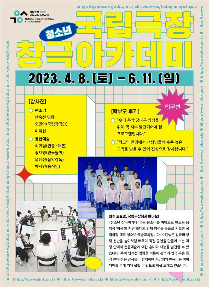 국립극장(극장장 직무대리 김진희)이 오는 2월 9일부터 ‘2023 국립극장 청소년 창극아카데미’(이하 ‘창극아카데미’) 입문반 수강생을 모집한다.