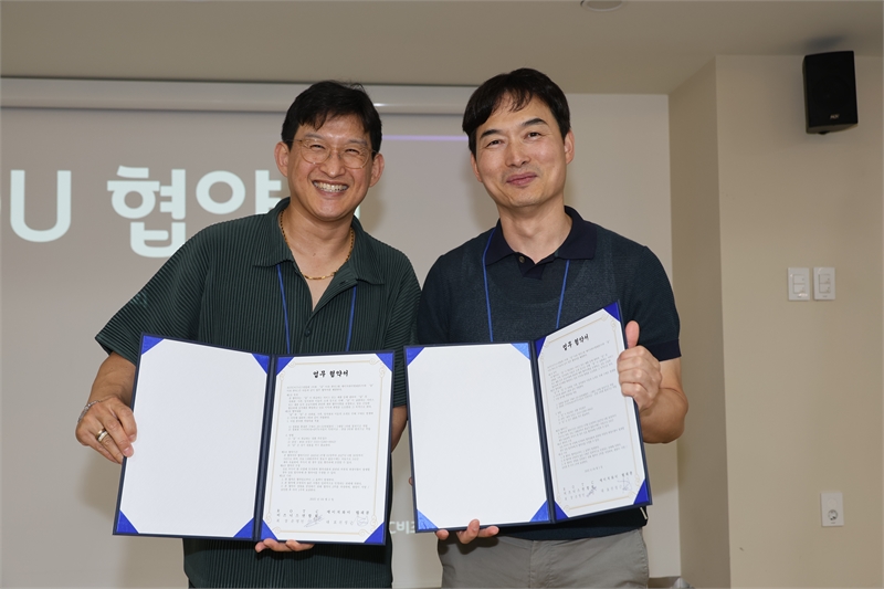 ▲알비연 손영민(41기/대전대)회장(왼쪽)과 에이치와이 진성근(38기/단국대)대표가 MOU체결 후 환하게 웃고있다.