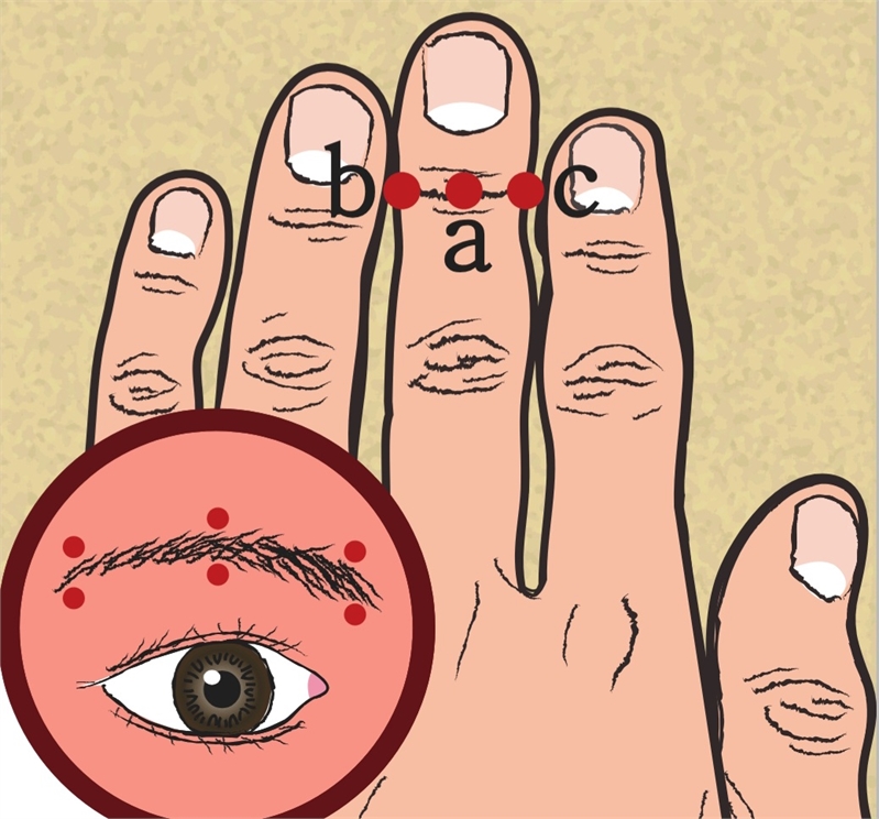 혼자서 하는 간단한 방법을 소개하겠습니다. 뒷목을 이완시켜서 눈으로 가는 혈액을 통(通)하게 하는 방법입니다. 양 중지손가락의 손톱 바로 위 주름의 중간점(a) 그리고 양 끝점(b), (c)을 눌러주세요. 그리고 눈썹의 안쪽, 중간, 바깥쪽을 엄지와 검지로 잡듯이 눌러주면 됩니다. 근시나 원시 뿐 아니라 다른 눈의 문제들도 좋아집니다.
