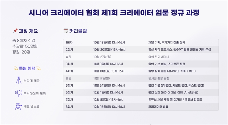 협회는 오는 10월 13일부터 진행되는 ‘제1회 시니어 크리에이터 입문 정규 과정’을 선착순 마감한다. 박 회장은 이번 과정을 “단순한 영상 제작 수업이 아니라, 참여자 한 명 한 명이 실제 성과를 낼 수 있도록 돕는 맞춤형 멘토링 과정”이라고 정의했다.